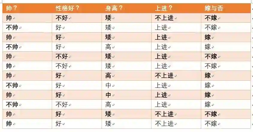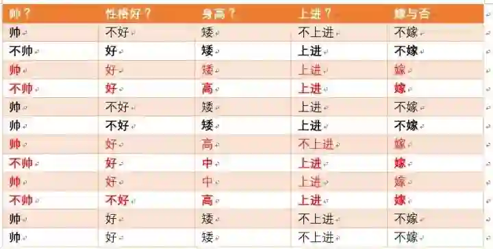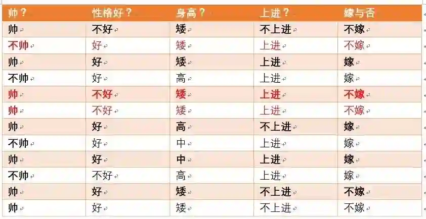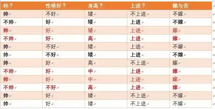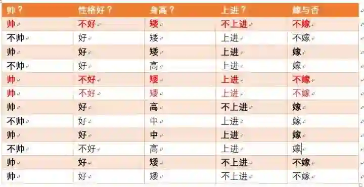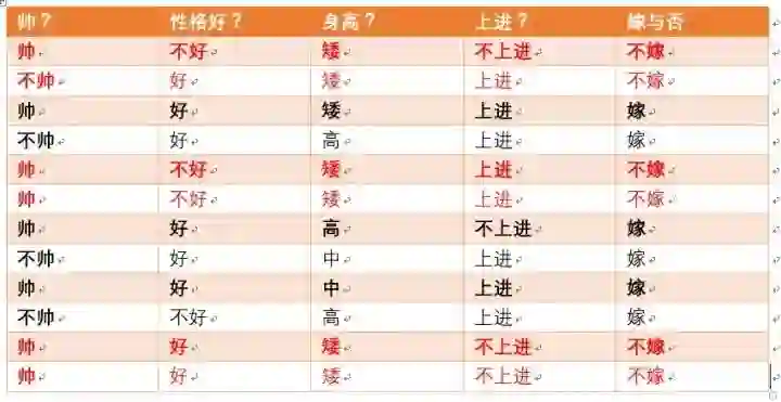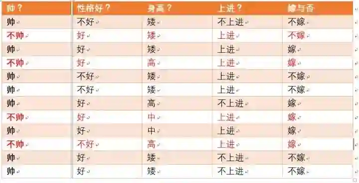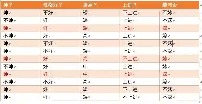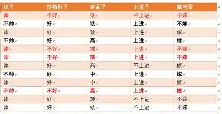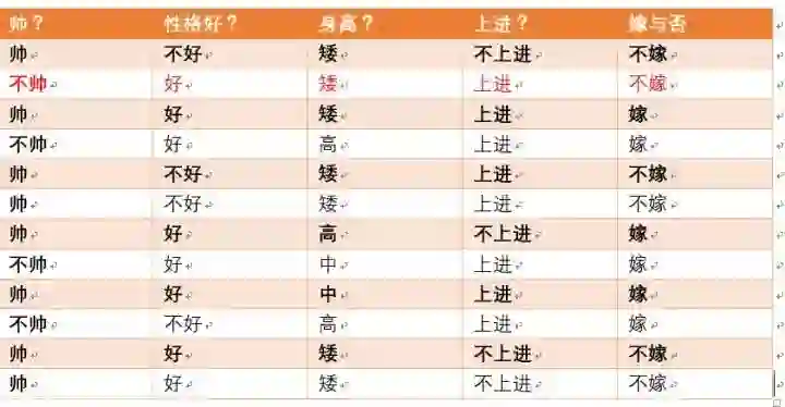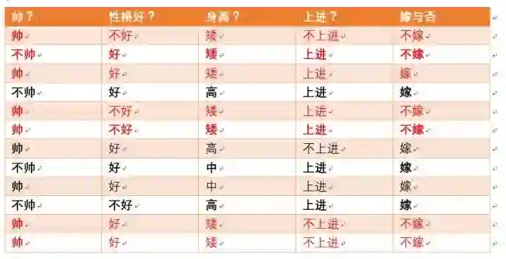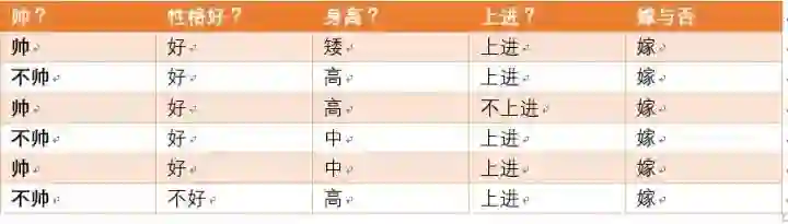 这个男生的四个特征是长相不帅,性格不好,身高矮,不上进,我们最终得出的结论是女生不嫁!很多人说这是一道送分题,哈哈哈哈。我们用数学算法也说明了不靠谱是取不到老婆滴!