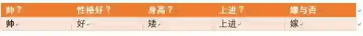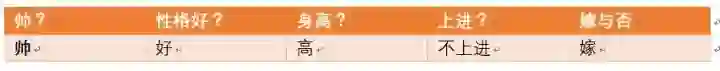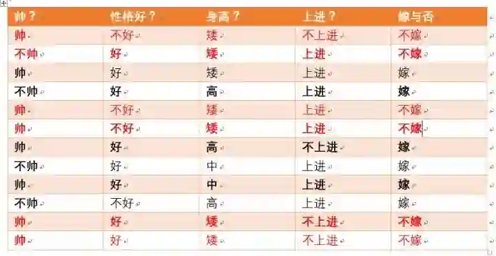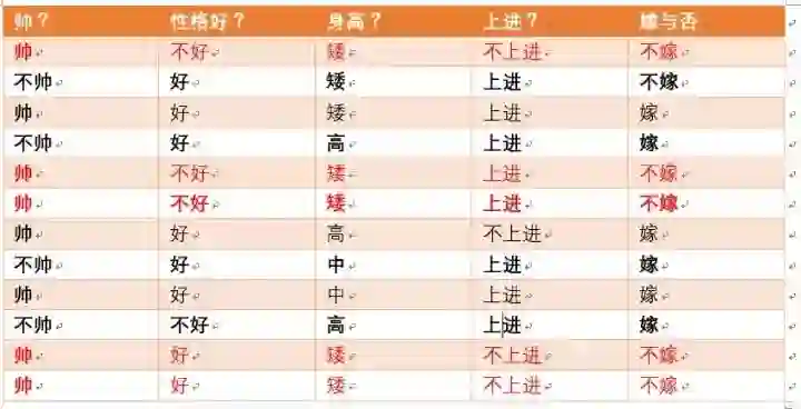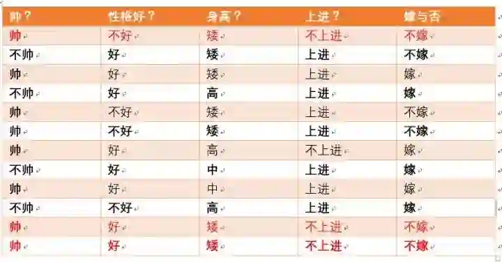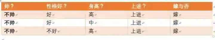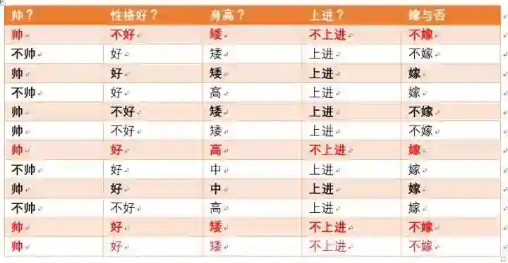 那么我们再来一个例子,假如此时另外一对情侣,这对情侣中,男生的四个特征是,长相帅,性格爆好,身高高,上进,那么他的女朋友嫁还是不嫁呢?可能又会有小伙伴说这是一道送分题,是不是,我们下面用事实说话!