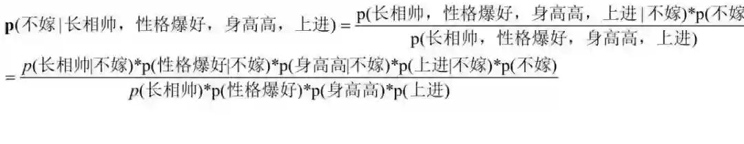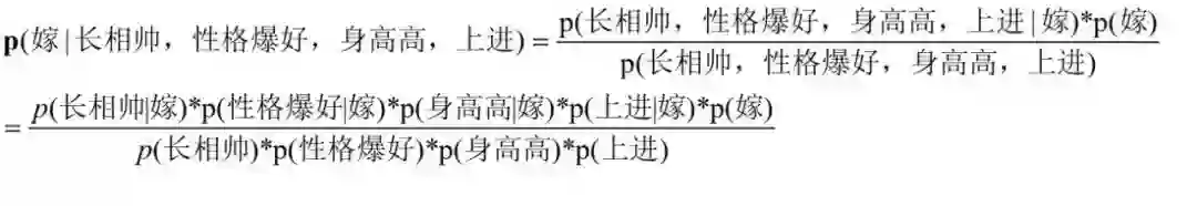 也就是要比较p(嫁|长相帅,性格爆好,身高高,上进)与p(不嫁|长相帅,性格爆好,身高高,上进)的概率大小。