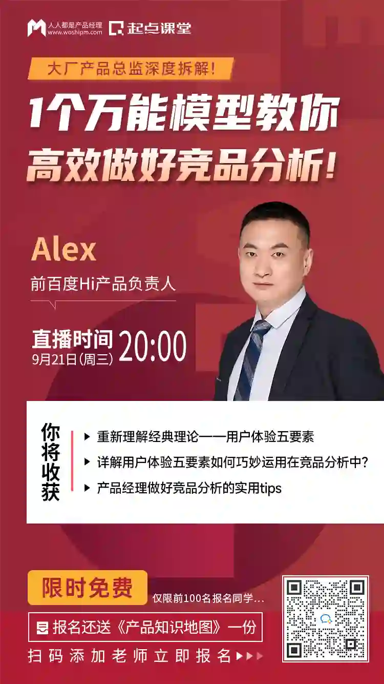 特邀前百度Hi产品负责人@Alex老师在线直播,1个万能模型帮你高效做好竞品分析!更有1V1互动答疑环节,帮助你避开竞品分析中的误区,分享做好竞品分析的实用Tips!