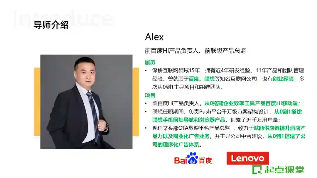 本次授课老师为前百度Hi产品负责人@Alex老师,老师深耕互联网领域15年,拥有近4年研发经验、11年产品和团队管理经验。