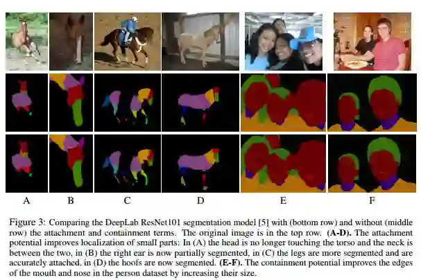 摘要:Many deep learning architectures for semantic segmentation involve a Fully Convolutional Neural Network (FCN) followed by a Conditional Random Field (CRF) to carry out inference over an image. These models typically involve unary potentials based on local appearance features computed by FCNs, and binary potentials based on the displacement between pixels. We show that while current methods succeed in segmenting whole objects, they perform poorly in situations involving a large number of object parts. We therefore suggest incorporating into the inference algorithm additional higher-order potentials inspired by the way humans identify and localize parts. We incorporate two relations that were shown to be useful to human object identification - containment and attachment - into the energy term of the CRF and evaluate their performance on the Pascal VOC Parts dataset. Our experimental results show that the segmentation of fine parts is positively affected by the addition of these two relations, and that the segmentation of fine parts can be further influenced by complex structural features.