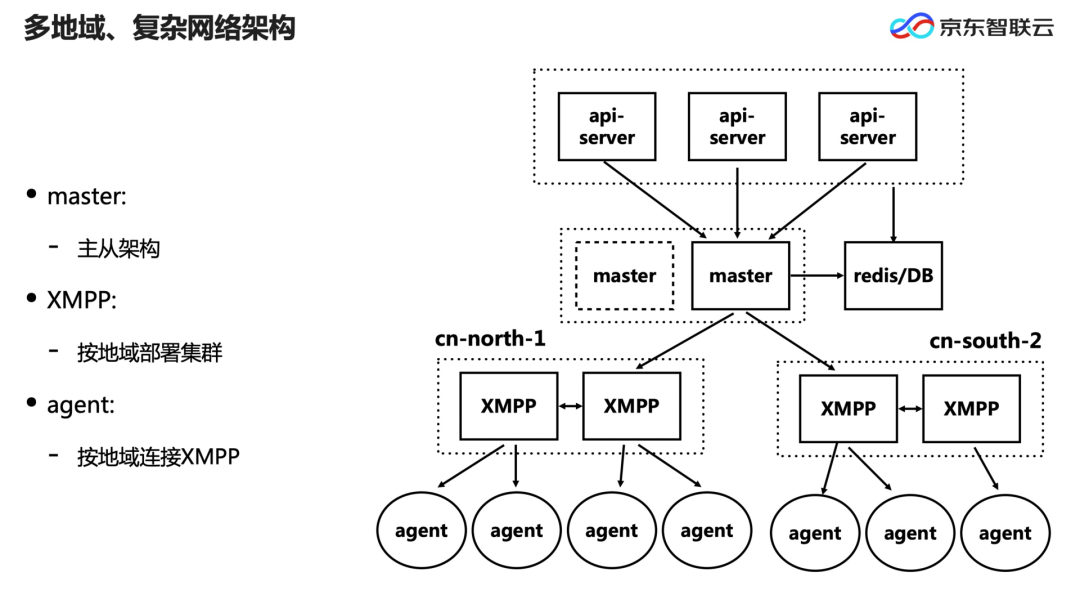 存在多个 master 时就需要考虑是否拆分 api-server。京东的选择是不做拆分,而 api-server 承接的业务逻辑最终形成一个 Redis 数据库作为一个中间件。负责不同地域的 master 启动后从中间件获取数据并分发任务,任务完成后也保存在中间件内。当外部用户查询 api-server,想要获得当前的任务状态时,api-server 会直接查询中间件,而非某个 master。
