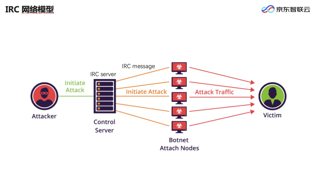 在 IRC 模型中,攻击者自己建一个 master,再加一个控制服务器来控制僵尸网络中的节点;攻击者通过 master 连接到控制服务器上即可操纵僵尸节点发起攻击。需要注意的是 IRC 是匿名聊天协议,系统不关心连上控制服务器的是什么身份,只要能连上就可以实施控制。