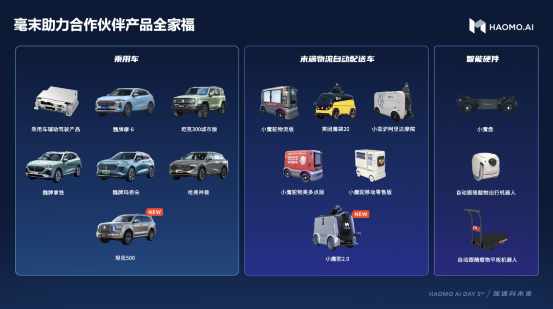 此外,在末端物流方面,毫末也与阿里达摩院、美团、物美多点等达成合作。会上,毫末智行还发布了国内首款10万元级别的末端物流自动配送车产品——毫末小魔驼2.0,单车售价12.88万元,预计在2022年5月陆续投放市场。
