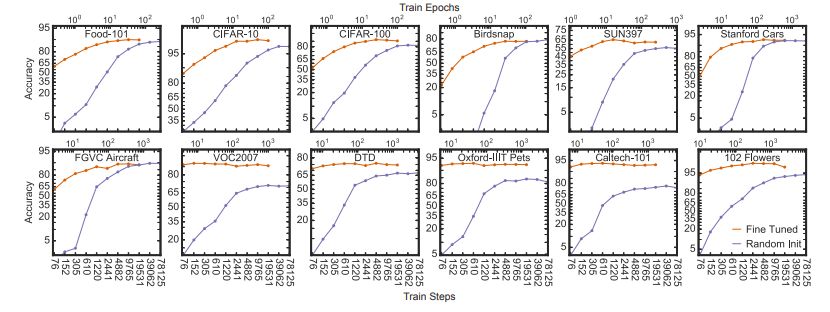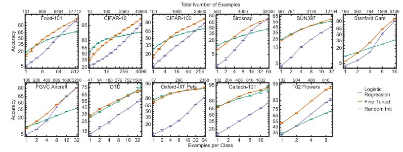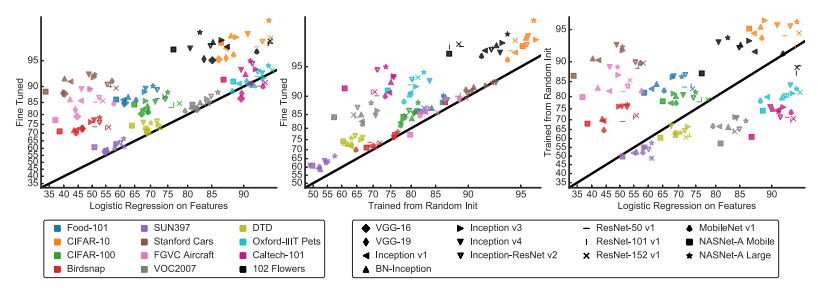 图 3: 对网络进行调优在固定的 ImageNet 特征上或从随机初始化模型开始的训练得到的特征取得了比 logistic 回归更高的准确率。在固定的 ImageNet 特征上的 Logistic 回归和从随机初始化开始训练的网络的性能在很大程度上取决于数据集。图中的坐标经过了合理的放缩。