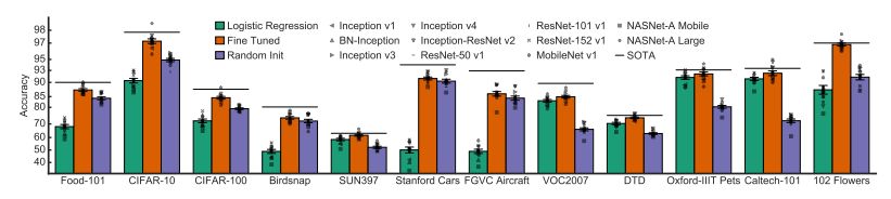 图 4: 对 ImageNet 调优取得了目前最好的性能。数据条表示 logistic 回归、参数调优以及从随机初始化开始训练的模型(不包括 VGG)准确率。误差条表示标准差。数据点代表独立的模型。黑色水平线代表之前最好的模型性能。