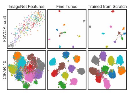 图 1: 细粒度数据集(FGVC 飞机)上的性能可以从调优或从头开始的训练中获得很大的提升,和 ImageNet 类似的数据集(CIFAR-10)上的提升则小一些。低维嵌入在从「inception v4」网络的倒数第二层中的特征上使用 t-SNE[13],用于测试集中的 10 个类别。