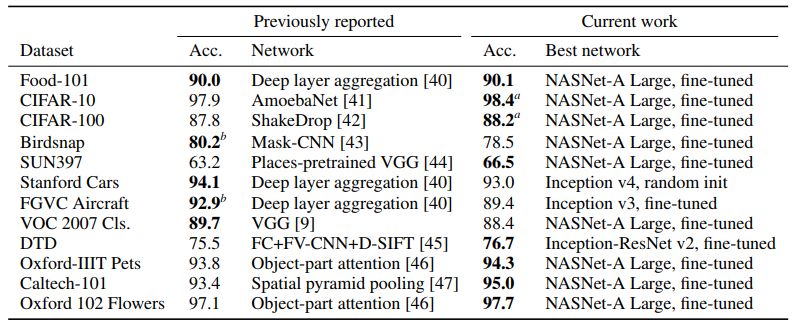 即使权重信息并不能在任务间很好地迁移,但是网络架构可以很好地被迁移。在 3 个小型细粒度分类数据集上,调优并不能为从随机初始化状态开始的训练提供显著的帮助,但是尽管如此,更好的 ImageNet 架构能取得更高的准确率。