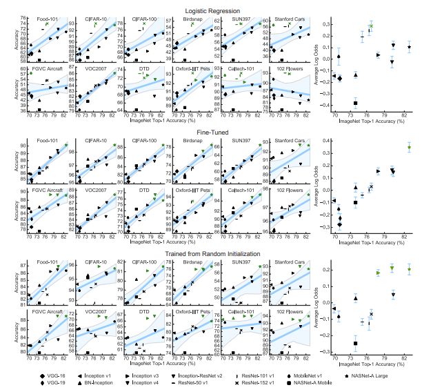 图 2: 在 ImageNet 上取得的准确率对于迁移到其它数据集上的经过了调优的模型有很大的预测作用。每组图片都测量了使用固定的 ImageNet 特征(最上面的一组)、经过调优的网络(中间的一组)、以及随机初始化的网络(最下方的一组)在 ImageNet 上的准确率和迁移任务的准确率之间的相关性。左图:不同的训练环境下,在迁移数据集上的分类准确率(y 轴)和最佳的 ImageNet 模型的准确率(x 轴)之间的关系。右图:相对于数据集上所有分类器的平均值,在数据集上正确分类的平均对数几率。误差条表示标准差。与最佳模型没有显出差异(p>0.05)的模型对应的点为绿色。