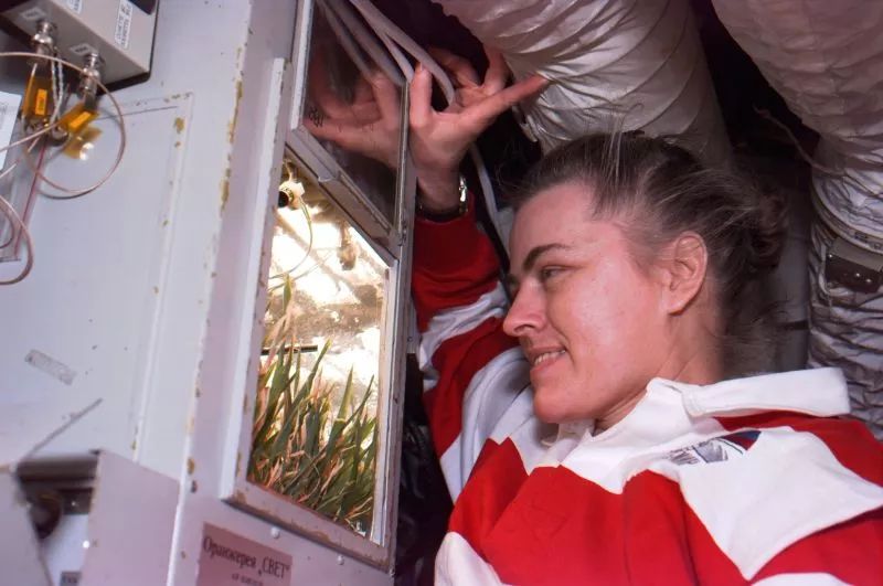 1996年9月:航天员Shannon Lucid在欣赏和平号上发芽的小麦。(图片来源:NASA)