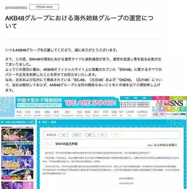 终于在2016年6月9日,AKS发表声明称SNH48单方面违约;次日,SNH48在官网发布公告,表示SNH48是一个完全独立的、自主经营的中国本土化大型女子偶像团体,和基于互联网思维的造星平台。和AKB48只是合作关系,并无违约。