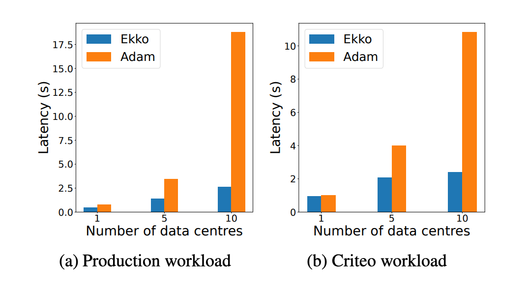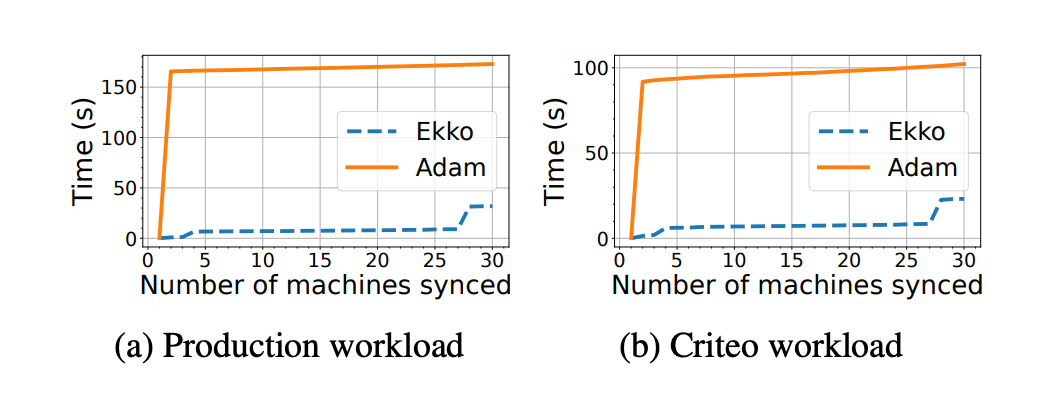 同时,本文也在异构广域网上进行了实验,对比 Ekko 系统和 Adam 系统在不同同步机器数量的情况下的延迟时间,实验效果如下所示,同样验证了 Ekko 的低延迟性能。