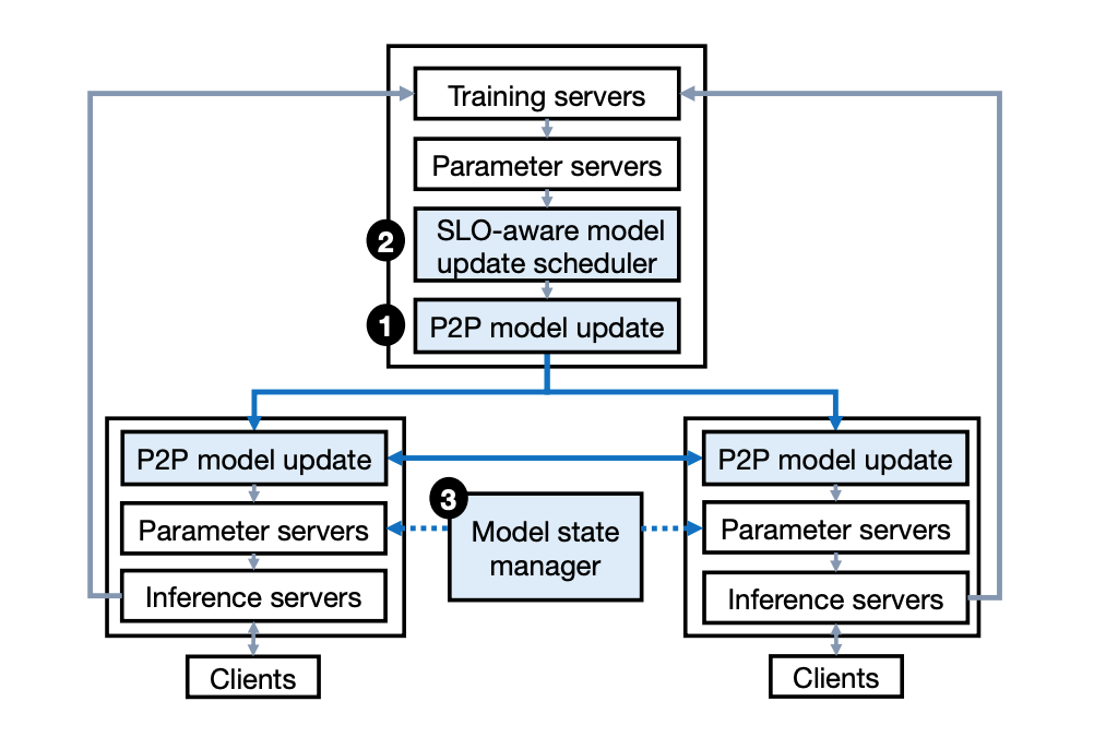 本文希望探索一种 DLRS 系统设计方案,能够在不降低 SLO 的前提下实现低延迟的模型更新。本文的关键思想是允许训练服务器在线更新模型并立即将模型更新传输到所有模型推理集群。这一设计允许我们绕过离线训练、模型检查、验证、传播等高延迟步骤,从而减少模型更新延迟。