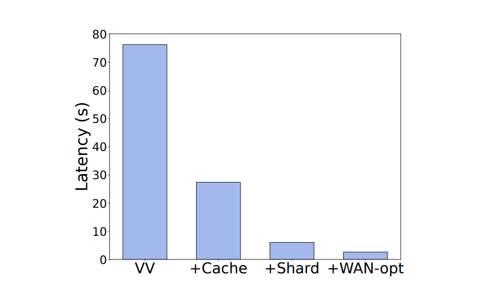 为了进一步探究 Ekko 进行同步时各个模块的单独时间开销,我们进一步分解模型模块,以验证其对 Ekko 低延迟性能的贡献,结果如下图所示。首先,我们构建了一个只使用碎片知识的 Ekko 系统,在下图中标记为 VV。之后,我们分别在这一基线模型基础上添加更新缓存(+Cache)、碎片版本(+Shared)以及广域网优化(+WAN-opt)。从下图结果中可以看出各个模块对降低同步延迟的作用。