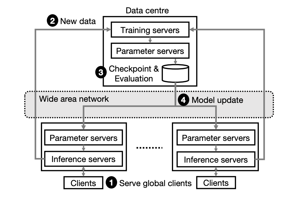 为了保证对新用户和新内容进行快速服务,DLRS 必须持续地更新机器学习模型。这一过程首先利用训练服务器收集新的训练数据,并计算模型梯度;接着利用广域网将模型更新传播到各个参数服务器的备份模型。