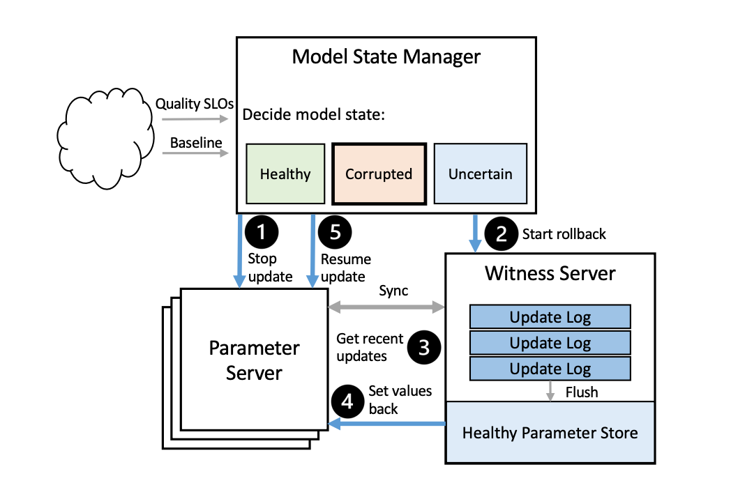 Ekko 采用见证服务器对不健康模型状态进行回滚。见证服务器参与副本同本,但不参与模型训练。与参数服务器不同,见证服务器不会立即将更新的参数储存进参数仓库,并且不会在同步中运行优先级调度。具体来说,Ekko 将未存储的参数更新插入日志中,每篇日志与同步的物理时间戳对应。当短时间内有多个同步操作时,Ekko 对其进行合并以节省空间。下图展示了回滚模型状态的工作过程。