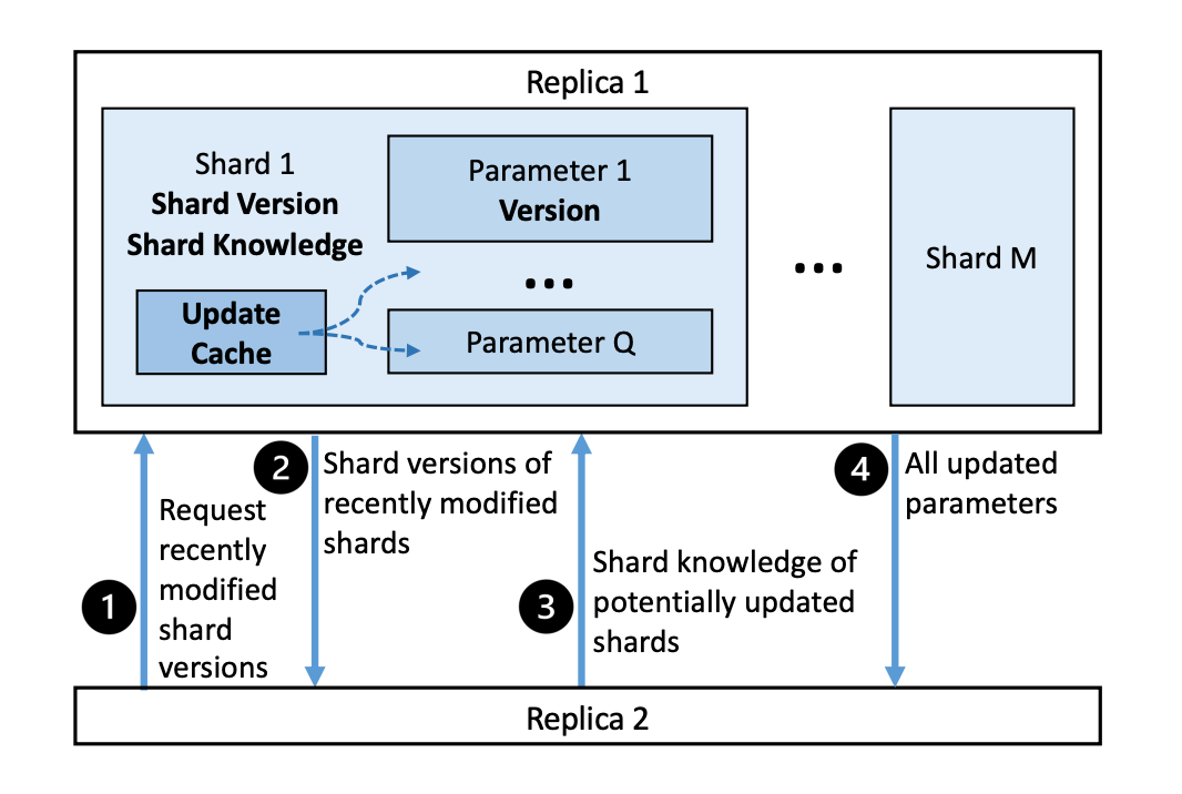 除了参数更新缓存,我们采用碎片版本维护来捕捉碎片数据和副本之间的因果关系。碎片版本中包括了一个单调递增的不重复计数器,以及与这一版本相关的副本 id。基于这一碎片版本维护机制,副本间可以通过交换和对比碎片版本列表,确认哪些碎片可能需要更新,从而高效地寻找各个副本中需要更新的模型碎片。
