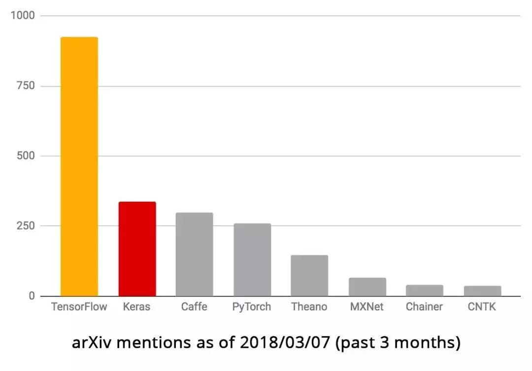 今年 3 月,Keras 作者 François Chollet 使用 Google Search Index 展示了过去三个月 ArXiv 上提到的深度学习框架排行,其中 TensorFlow 排名第一,Keras 排名第二,而且两者差距明显。