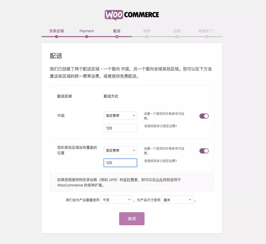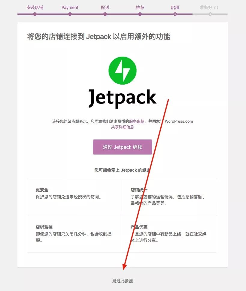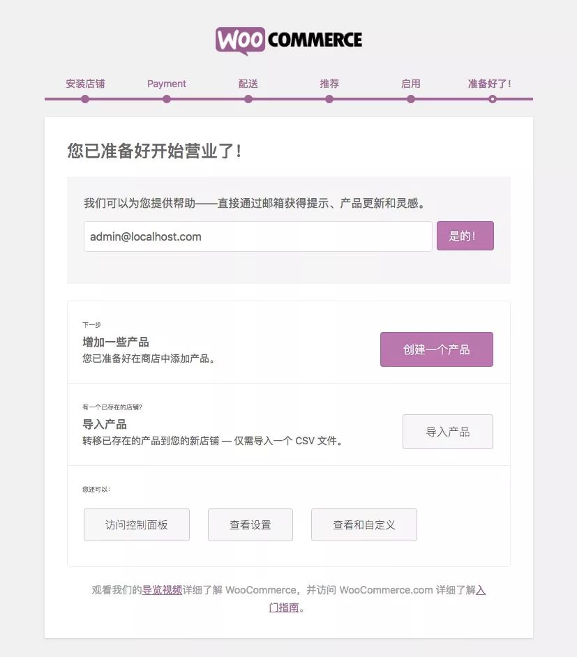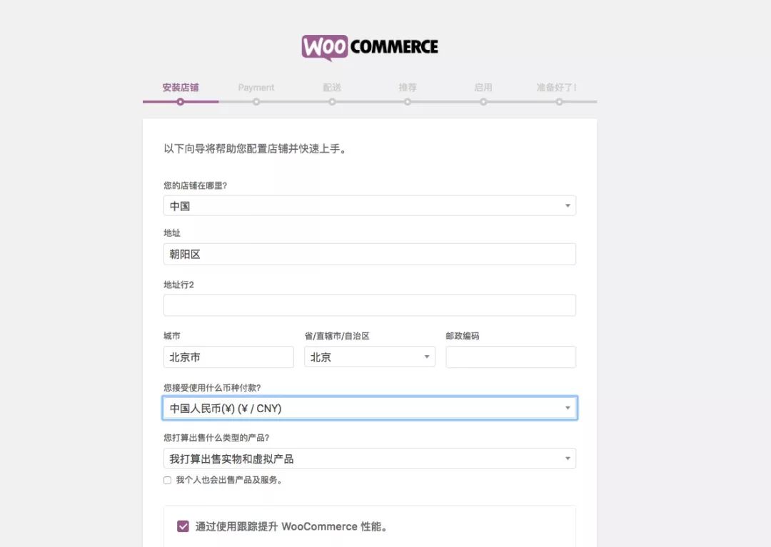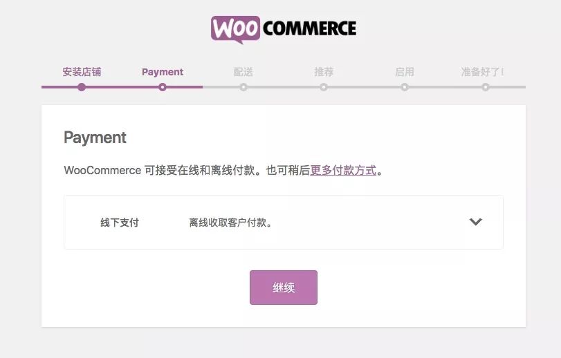 启用插件后, WooCommerce 会引导你进行初始化配置,根据提示对插件进行配置。