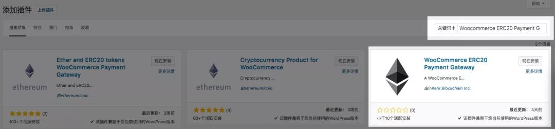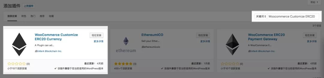 打开“插件”-“安装插件”,在关键词中输入 “Woocommerce Customize ERC20 Currency[4]”并回车。这是我们联合硬核区块链公司开发的一款用于给 WooCommerce 增加 ERC20 货币的插件,该插件已经开源于 GitHub[5]。