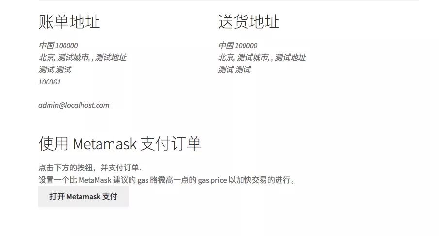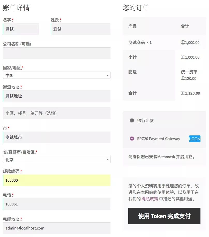 输入账单地址(账单地址将作为收货地址显示在界面中),点击“使用 Token 完成支付”。