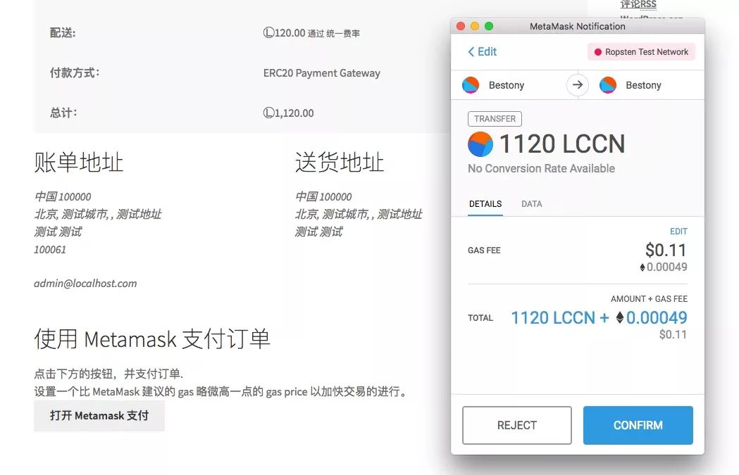 在结算页面,拖动到底部,可以看到支付按钮,点击支付按钮,会自动唤起浏览器的 Metamask 插件。