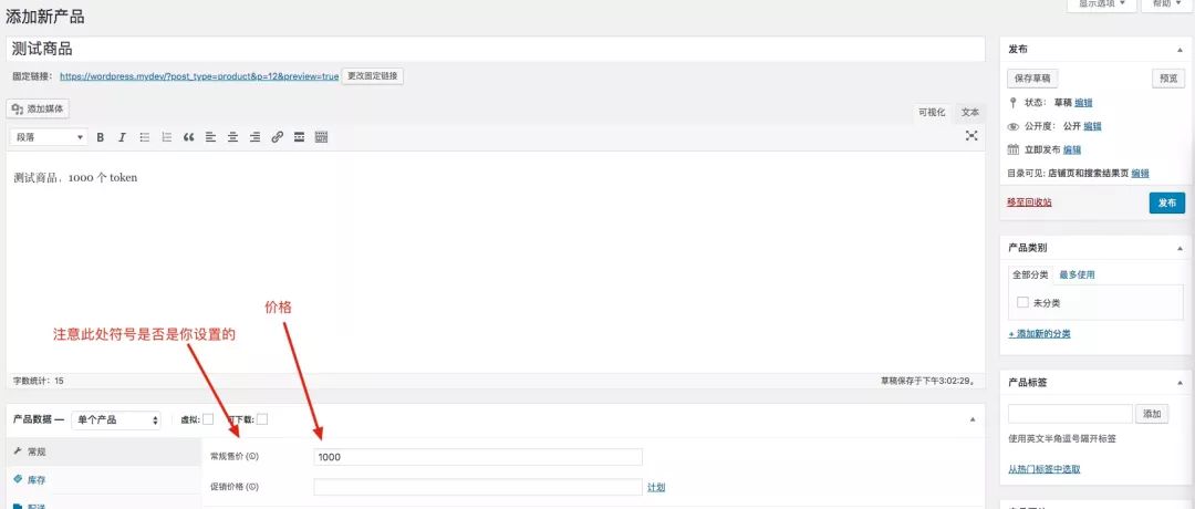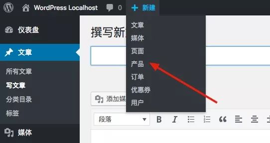 插件设置完成后,我们来新建一个产品,用于测试。点击顶栏中的“新建”-“产品”,进入到创建产品的界面。