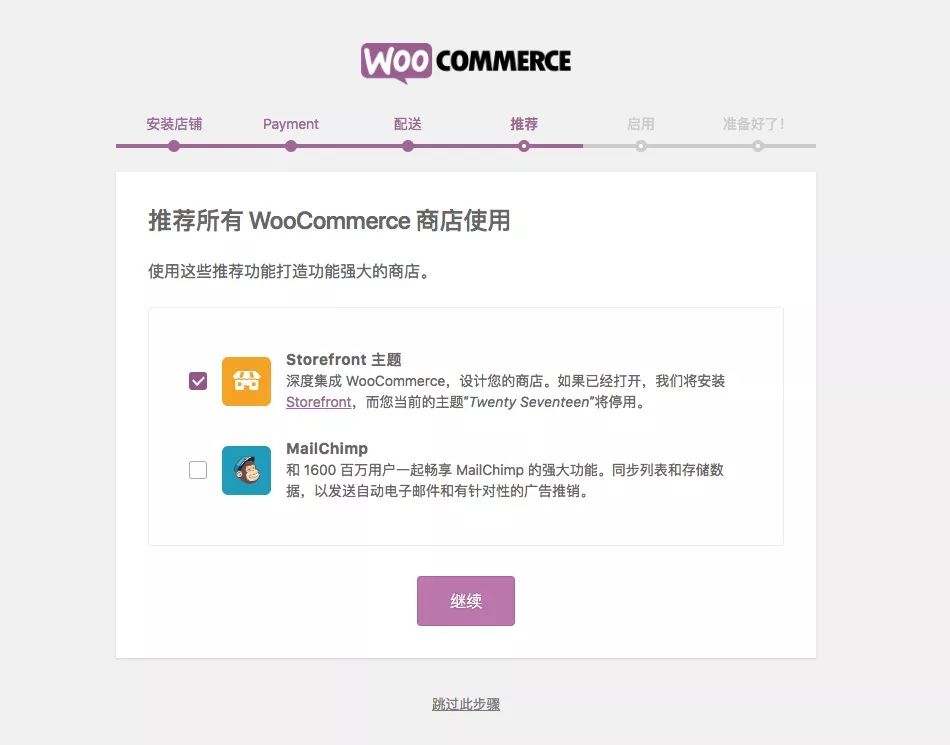 插件安装时,取消 MailChimp 的安装,仅启用 StoreFront: