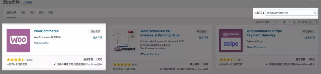 安装完 WordPress 后,接下来安装 WordPress 的商城插件 WooCommerce ,点击菜单栏中的“插件”-“安装插件”,访问到安装插件的界面,在界面右上角的搜索框内容输入“WooCommerce”,并按下回车,可以搜索到 WooCommerce 。