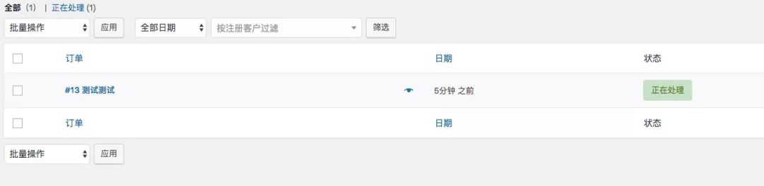 用户支付完成后,如何确定订单已经支付完成了呢?进入后台“仪表盘”-“WooCommerce”-“订单”,可以看到用户所有的订单。