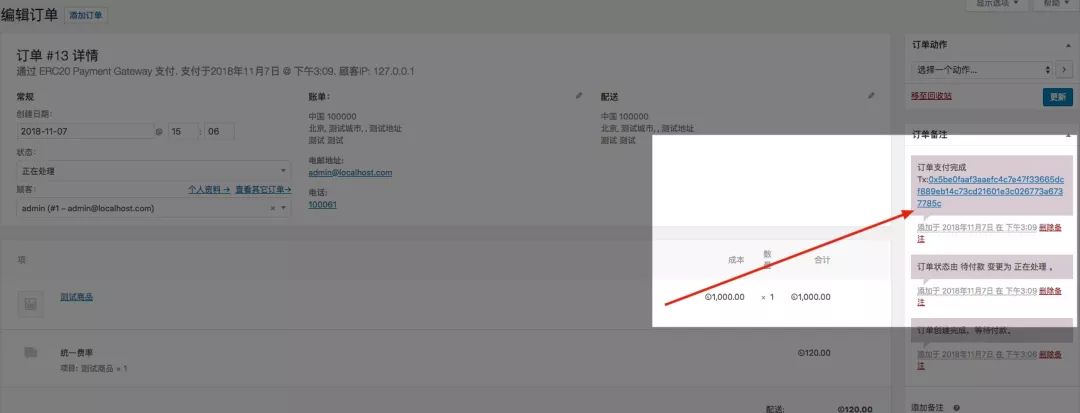 正在处理状态的订单为用户已经支付完成,还没有处理的订单。点击该订单,进入到订单详情,在右侧的“订单备注”中可以看到交易的 Tx 值 。你可以点击对应链接,查看交易是否完成。