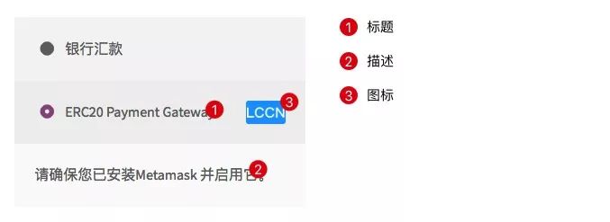 描述会展示在支付方式的下方,同样的,你可以设置为 “使用 LCCN 支付费用”,此外,还建议你在此引导顾客安装、并打开 Metask 插件,切换到主网络,确保后续支付。