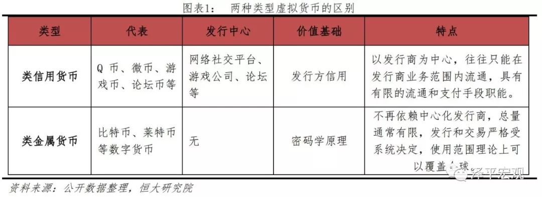 一类是以腾讯公司的Q币、盛大公司的点券、各种论坛币、游戏币为代表的,有发行中心的类法定虚拟货币,其如信用货币一样,往往是信用货币,其发行受中心化机构决定。一类是以比特币等数字货币为代表的去中心化类金属虚拟货币,正如同现实生活中贵金属产量有限一样,类金属虚拟货币的货币发行数量往往受到算法严格限制。它们之间的主要区别如下: