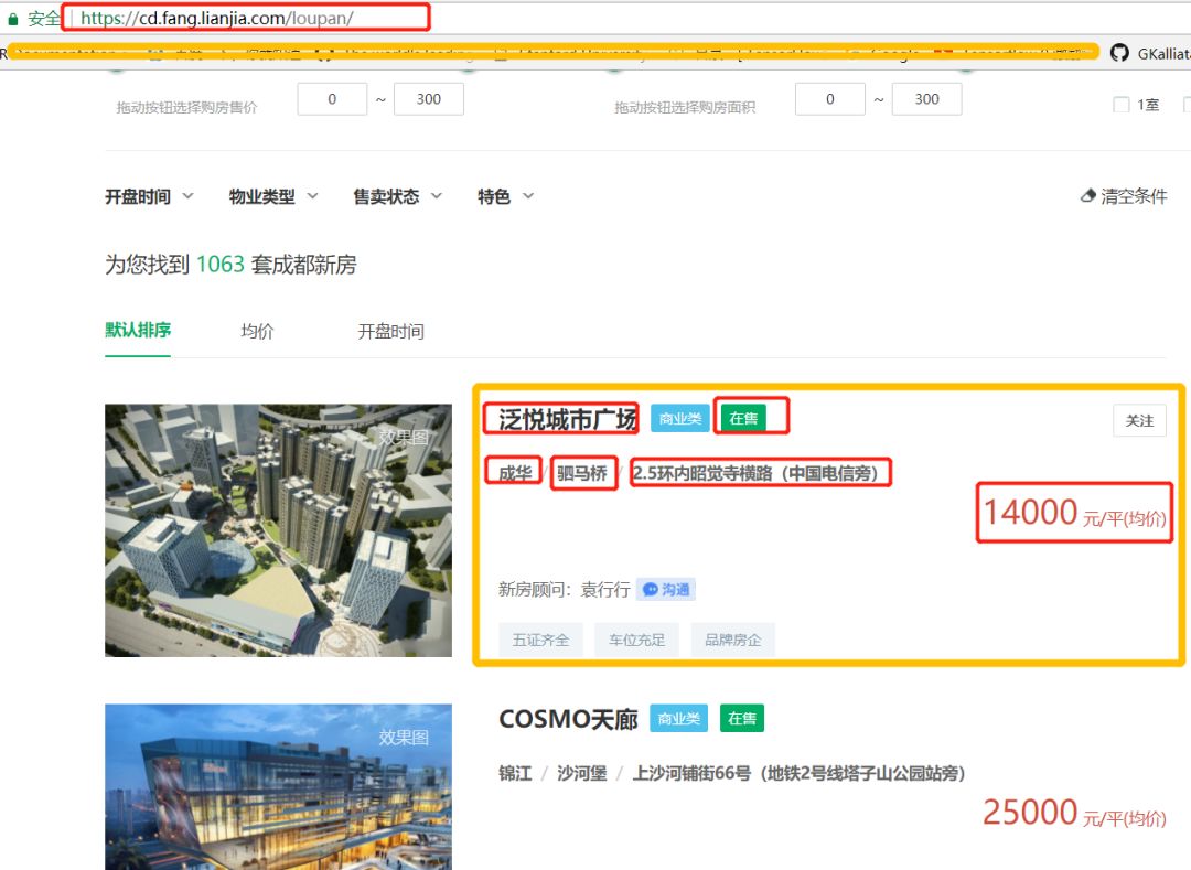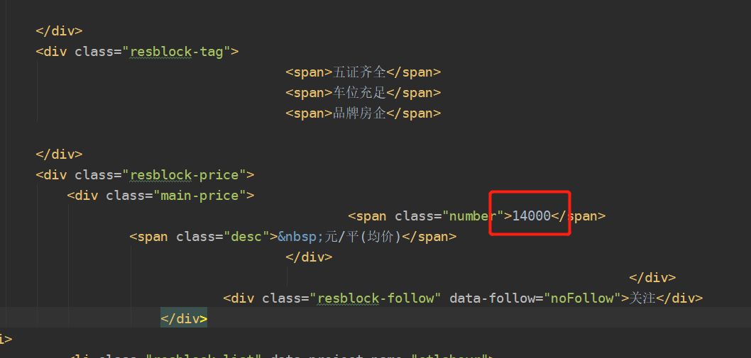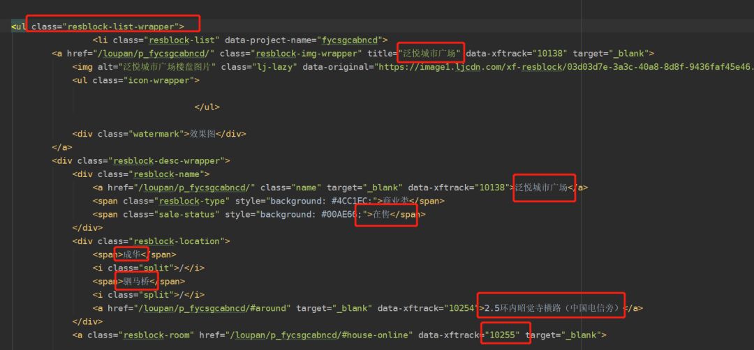 然后我们主要关心的数据有楼盘的名字,售卖状态,地点以及价格等。然后查看网页源码之后发现,我们想要的数据在resblock-list-wrapper这个class里面。所以首先取到这个class下面的全部内容,然后再挨个提取我们想要的数据。