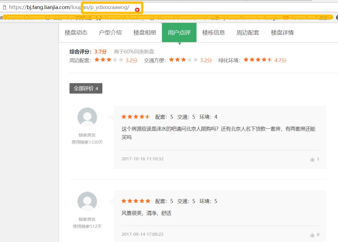花了大半天的时间,做了这些,然后链家里面有价值的数据我觉得还有房源的评论数据,这个数据其实也不难爬,可以给大家看看。我们点房源的评论,网页就跳转到这个页面,url后面跟的这个是什么呢?