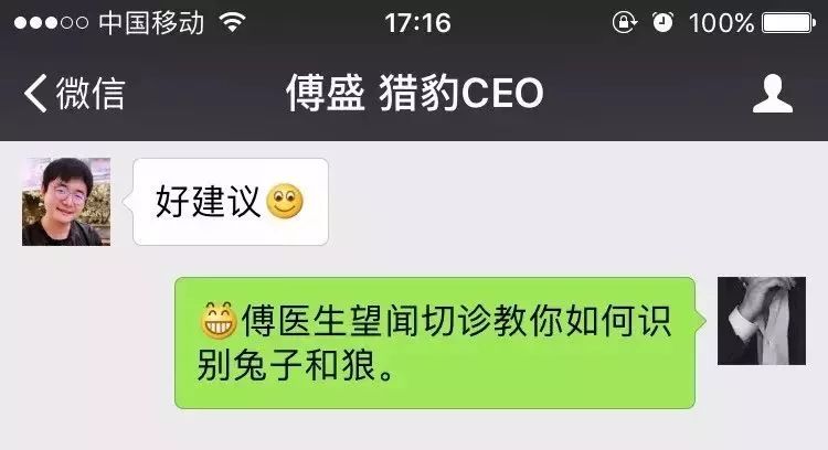 带着这个疑问,我找到了傅盛的微信,等他通过我的好友请求后,我和他聊了相关问题,希望他写篇《如何辨别狼和兔子》的文章,然后他也表达了一些自己的观点。
