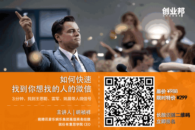 (3)加入创业邦会员,今日购买会员即送300元无门槛优惠券,获得30+堂价值4888元的CEO创业必备课程、3000+创业人脉、社群资源对接;千元文档大礼包;免费参加创业邦全年峰会及无限次参加线下活动!扫码即可获得: