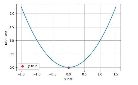 从直觉上理解均方差损失,这个损失函数的最小值为 0(当预测等于真实值时),最大值为无穷大。下图是对于真实值
