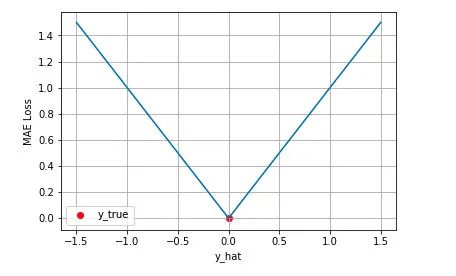 同 样的我们可以对这个损失函数进行可视化如下图,MAE 损失的最小值为 0(当预测等于真实值时),最大值为无穷大。可 以看到随着预测与真实值绝对误差