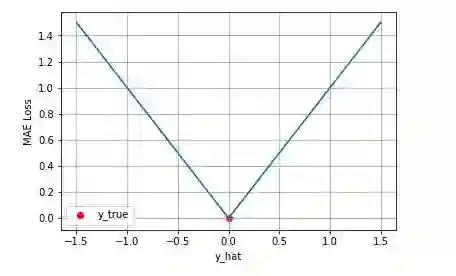 同 样的我们可以对这个损失函数进行可视化如下图,MAE 损失的最小值为 0(当预测等于真实值时),最大值为无穷大。可