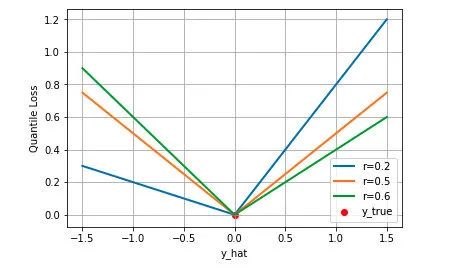 下图是取不同的分 位点 0.2、0.5、0.6 得到的三个不同的分位损失函数的可视化,可以看到 0.2 和 0.6 在高估和低估两种情况下损失是不同的,而 0.5 实际上就是 MAE。