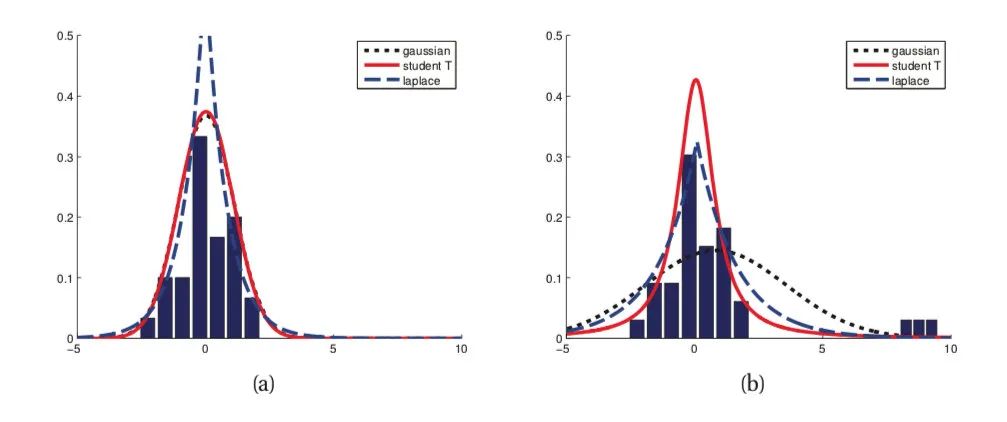 参考下图(来源:Machine Learning: A Probabilistic Perspective 2.4.3 The Laplace distribution Figure 2.8),当右图右侧出现了 outliers 时,拉普拉斯分布相比高斯分布受到的影响要小很多。