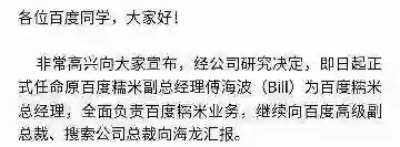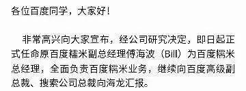 一封任命邮件截图近期在百度糯米员工内部传阅。该邮件称,百度糯米副总经理傅海波(Bill Fu)升任百度糯米总经理,全面负责百度糯米业务。多位百度糯米人士表示,百度糯米在短期内应不涉及出售事宜,糯米正在配合百度feed战略,成为生活服务商家的本地化广告平台。