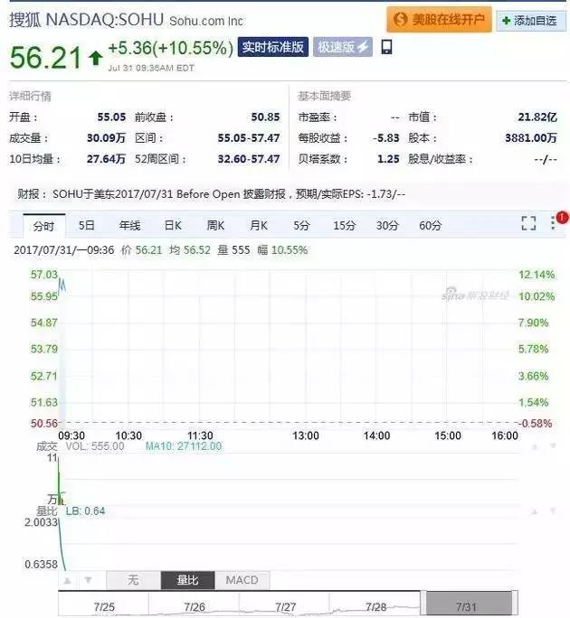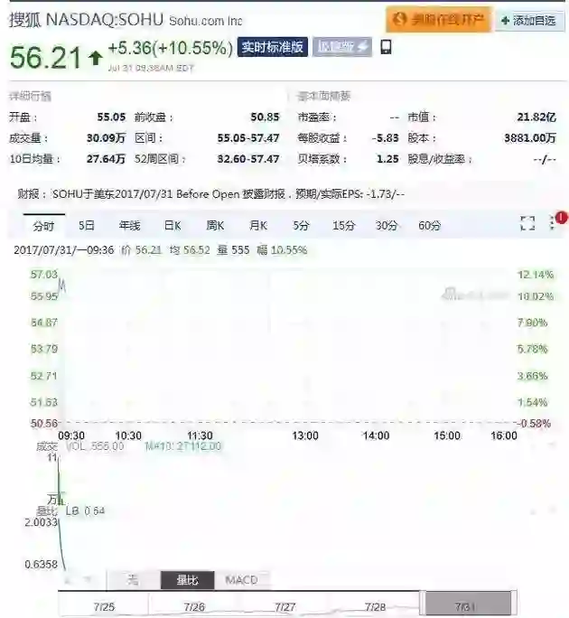 搜狐发布第二财季财报,财报显示其第二财季营收4.61亿美元同比增长10%,环比增长23%。超出分析师预期,预期为4.32亿美元。由于搜狗上市和搜狐第二财季营收表现亮眼,搜狐股价大涨10.55%,至56.21美元/股。