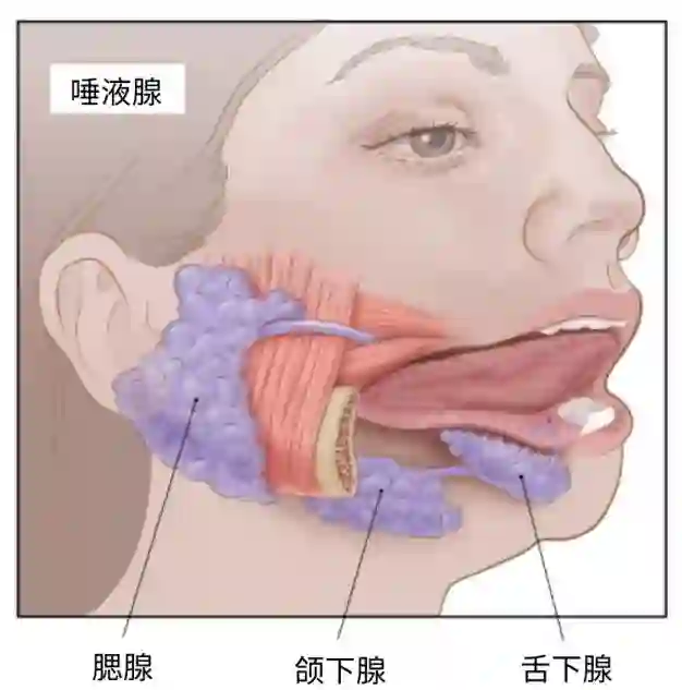 舌下腺囊肿,不管是小孩或大人,都可能发生。在舌下口底区,薄薄的口腔粘膜下,对称地分布着一对舌下腺,如下图所示。舌下腺周围分布着下颌下腺导管、舌神经、舌下动静脉分支、舌下神经、下颌下腺等重要结构。