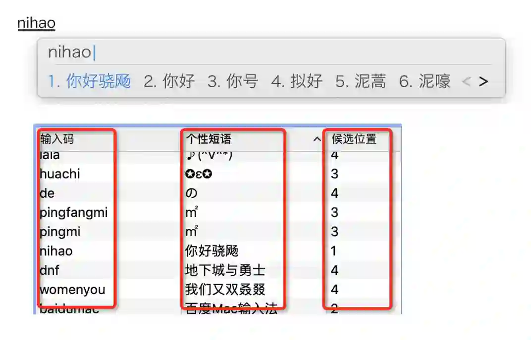 这里我们再加一层按键字母组合和汉字的映射表,好比英汉字典,这层我们称为输入码,输入码到内码的过程就是一次查表转换操作,比如「nihao」这几个ASCII字符,大家可以随便修改映射表以及候选编号,我可以把他映射成「你好骁飏」。