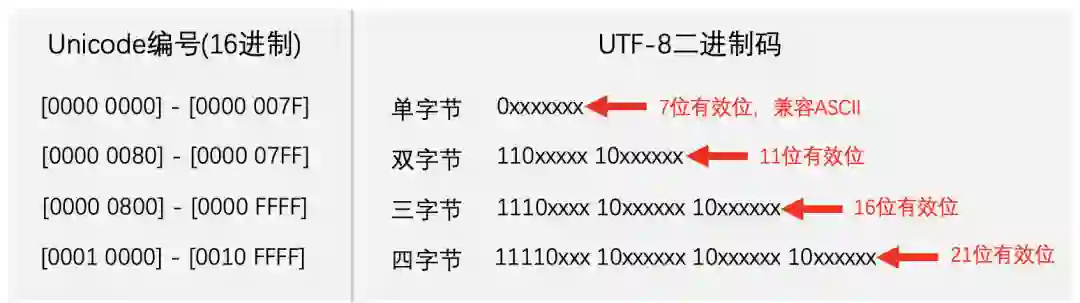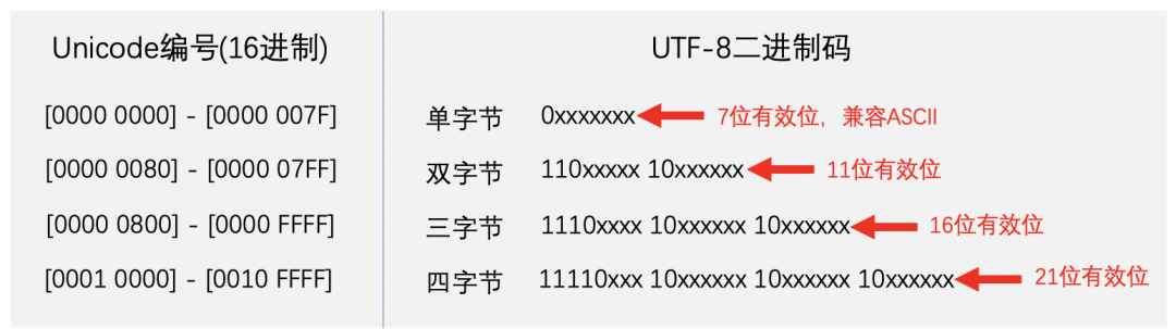 UTF-8需要兼容ASCII,所以也需要有前缀码来控制,前缀规则如下: