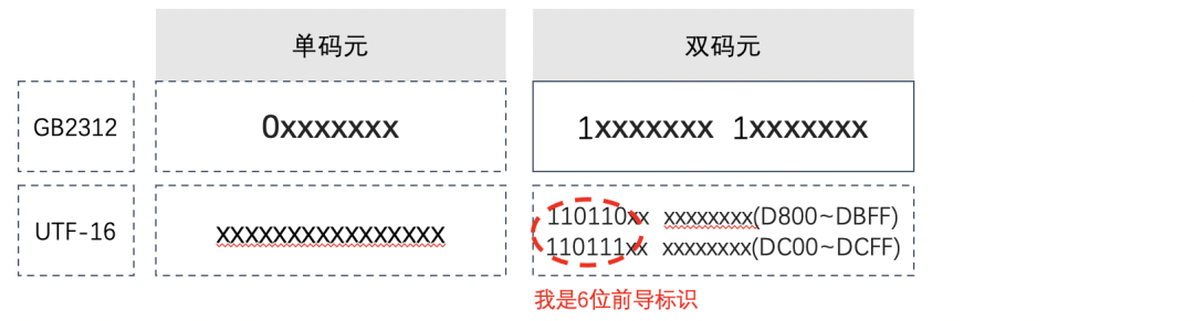 这就需要一个前导识别,比如GB2312识别第一个字节高位是不是1来判断是单字节还是双字节,但是UTF-16的高位1已经被用来编码了,当然这也难不倒我们,第一位被用了那么就用前几位的组合形式。
