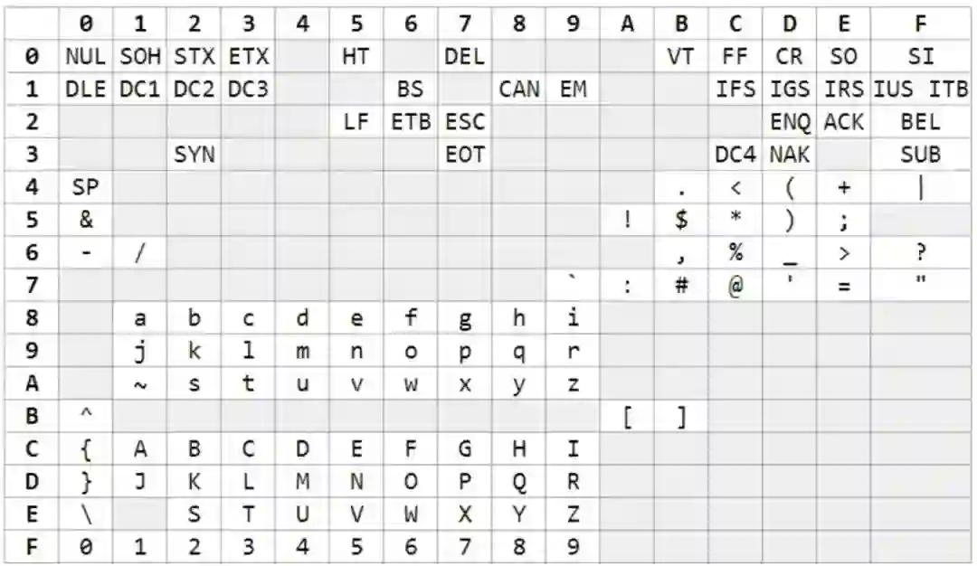 其实早在ASCII之前,IBM在1963年也推出过一套字符编码系统EBCDIC,跟ASCII码一样囊括了控制字符、数字、常用标点、大小写英文字母。